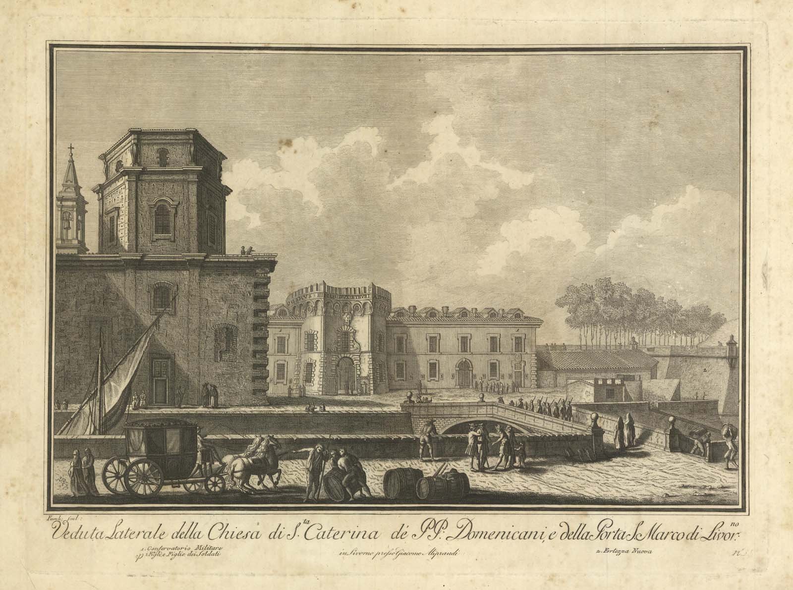 Veduta laterale della Chiesa di S.ta Caterina de PP. Domenicani e della Porta di S. Marco di Livorno