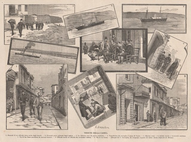 Composizione di nove vignette: 1. Funerali di un ufficiale turco ucciso dagli insorti - 2. Piroscafo greco catturato dagli inglesi - 3. La Sebenico nave da guerra austriaca - 4. Torpediniera che sorveglia il campo di Vassos - 5. Marinai russi - 6. Soldati turchi e vice console austriaco - 7. Via di La Canea presidiata da marinai francesi - 8. Ufficiali turchi ed ufficiale dei carabinieri italiani - 9. Via di La Canea. Testo al retro