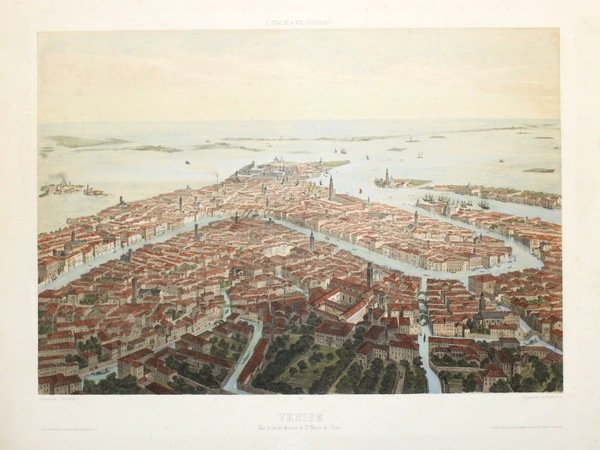 Litografia, mm 305x440, dipinta a mano. Non comune e fascinosa veduta a volo d'uccello della città lagunare verso oriente, colta sopra a Santa Maria dei Frari, tratta dal "L'Italie a Vol d'Oiseau", raccolta di vedute delle maggiori città italiane. La particolarità di queste vedute sta nel fatto che i disegni furono effettuati da Alfred Guesdon (1808-1876) a bordo di una mongolfiera. Buon esemplare con ampi margini peraltro con tracce di sporco superficiale e qualche piccolo difetto. Timbrino a secco dell'editore sotto il titolo. <BR>Litograph, hand colored, mm 305x440. Scarce general view towards east from above Santa Maria dei Frari, from "L'Italie a Vol d'Oiseau", a rare collection of view of the most important italian tows. The drawings by Alfred Guesdon (1808-1876) had been taken from a balloon. Good condition, margins with some surface dirt and minor defects<BR><BR>