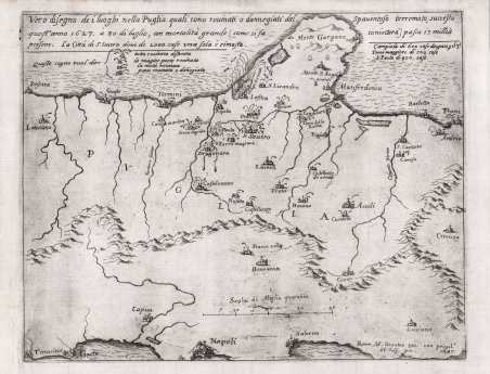 Vero disegno de i luoghi nella Puglia quali sono rovinati o danneggiati dal Spaventoso terremoto, successo quest'anno 1627.