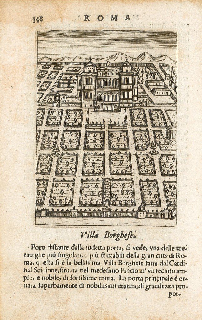 Incisione, antica ed originale, dei giardini e Villa Borghese. Autore: Rossi Michelangelo edit. Luogo: Roma. Anno: 1689. Tecnica: incisione in rame. Dimensioni: 165x110 il foglio.
