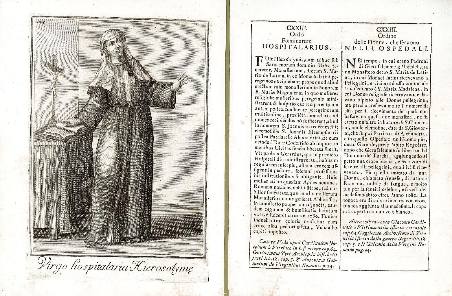 Incisione, antica ed originale, raffigurante una Donna dell'Ordine delle Donne che servono negli Ospedali accompagnata da pagina descrittiva divisa su due colonne, a sinistra in latino ed a desta in italiano, con la storia del costume dell’ordine militare rappresentato. Inserita nell’opera “Catalogo degli ordini equestri e militari. Esposto in imagini, e con breve racconto offerto alla Santità di N.S. Clemente XI dal P. Filippo Bonanni della Compagnia di Giesu” In Roma MDCCXI – Nella Stamperia di Giorgio Placco Intagliatore, e Gettatore di Caratteri à S. Marco. Con licenza de’ Superiori
