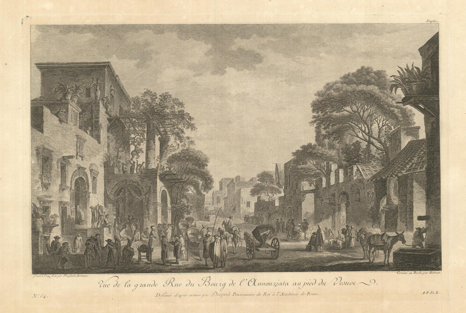 Veduta della strada principale, animata di personaggi, di Torre Annunziata. Tratta dalla prima edizione della monumentale opera edita da Jean-Claude Richard de Saint-Non, meglio noto come Abate di Saint-Non " Voyage ou Description des Royaumes de Naples et de Sicilie ". Pubblicata a Parigi dal 1781 al 1786.