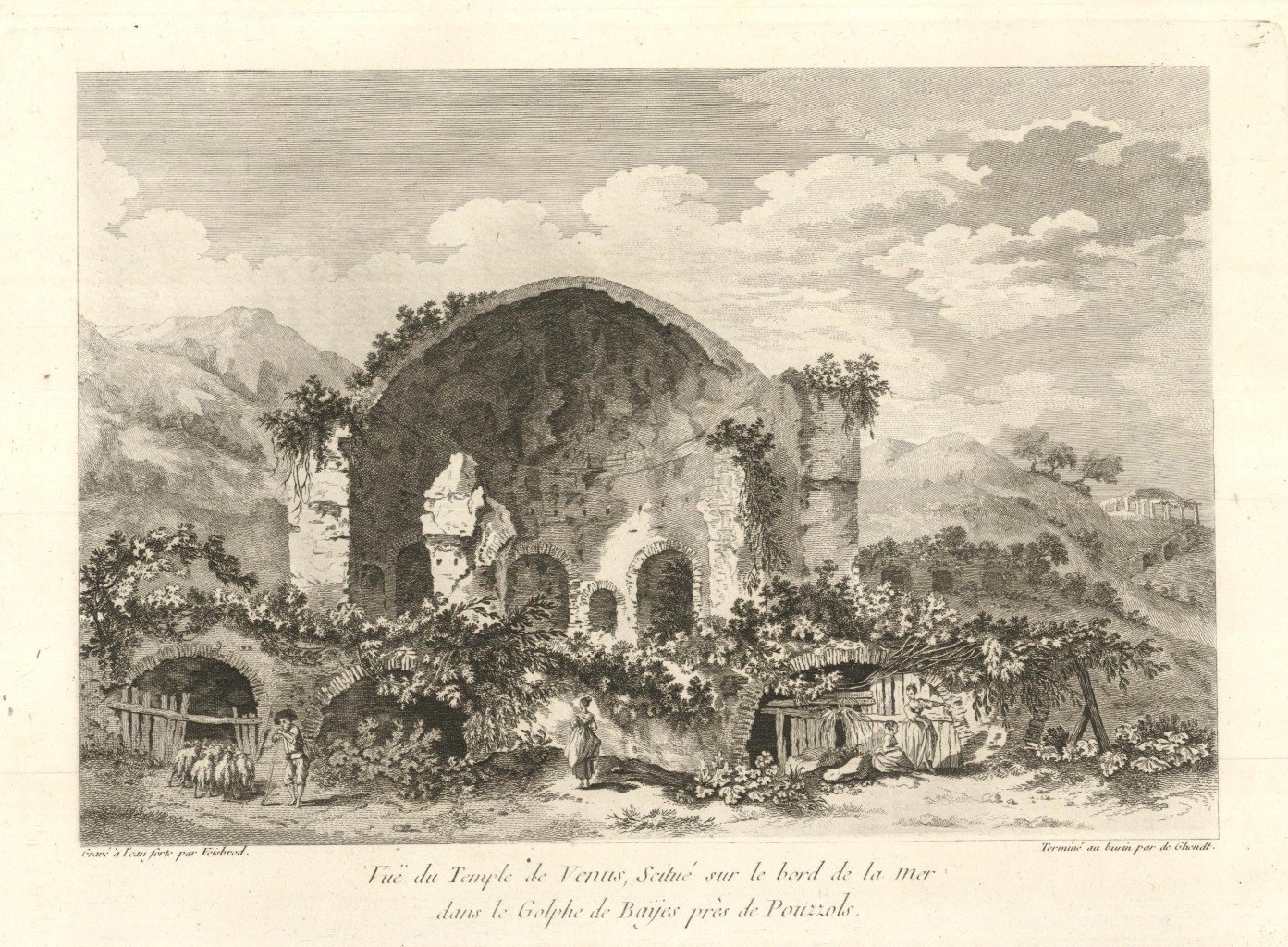 Veduta esterna del tempio di Venere nei pressi di Pozzuoli. Tratta dalla prima edizione della monumentale opera edita da Jean-Claude Richard de Saint-Non, meglio noto come Abate di Saint-Non " Voyage ou Description des Royaumes de Naples et de Sicilie ". Pubblicata a Parigi dal 1781 al 1786.